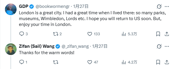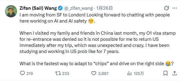 这名AI天才叫王子帆(Zifan Wang,又称Sail Wang),根据他在社交媒体X平台上发帖称,“我要从旧金山搬到伦敦啦!很期待和这里从事人工智能和人工智能安全工作的人们交流。上个月我去中国探望家人朋友时,我的O1签证被拒签了,所以这次旅行结束后我无法立即返回美国,真是意想不到,太疯狂了。我在美国学习和工作大概有七年了。”他还幽默地询问:“适应‘chips’(薯条)和靠右行驶的最快方式是什么?😂”